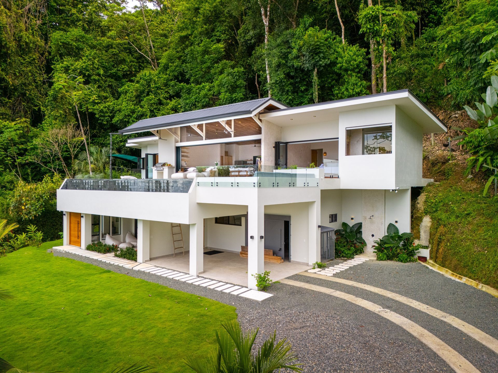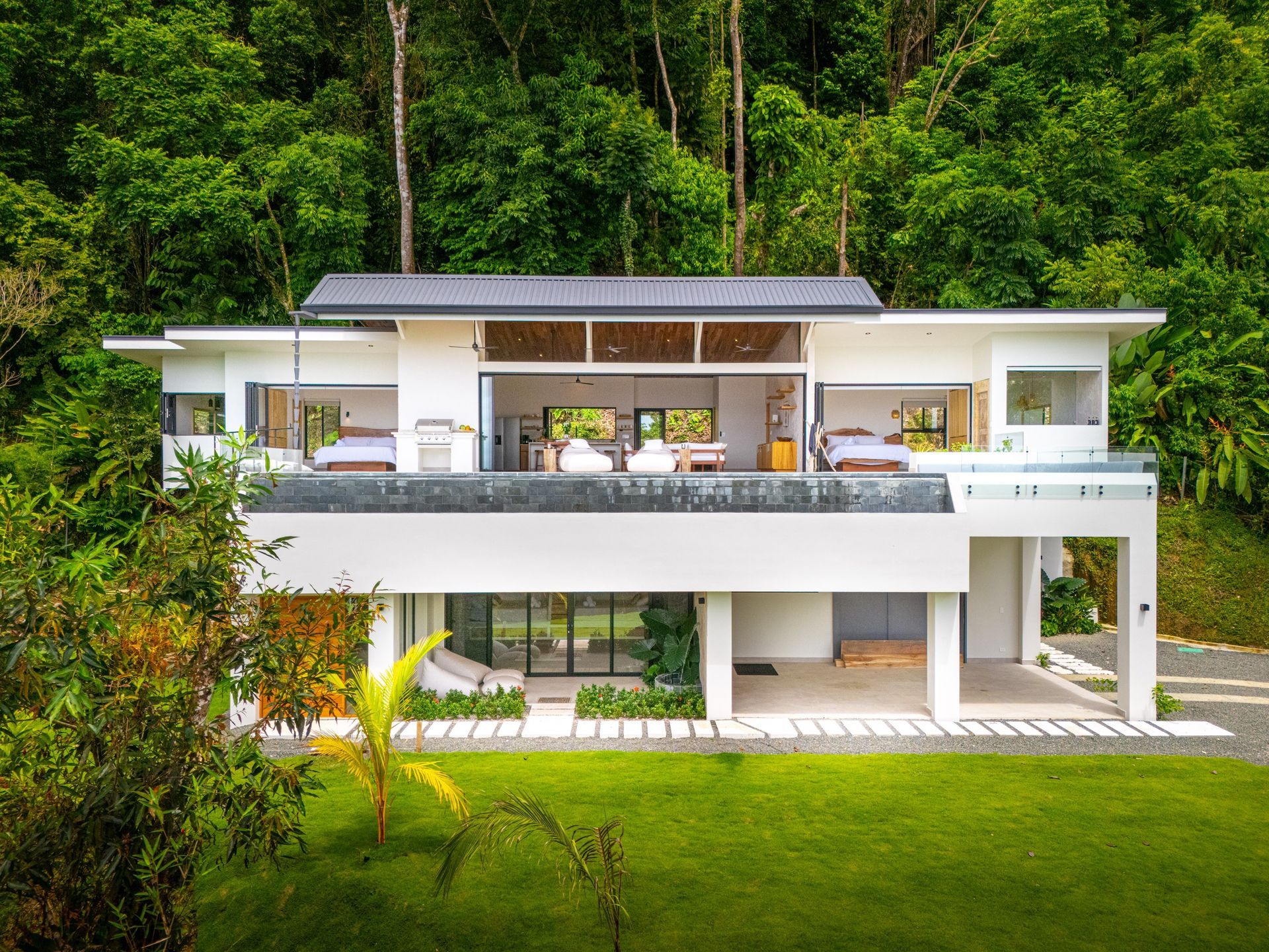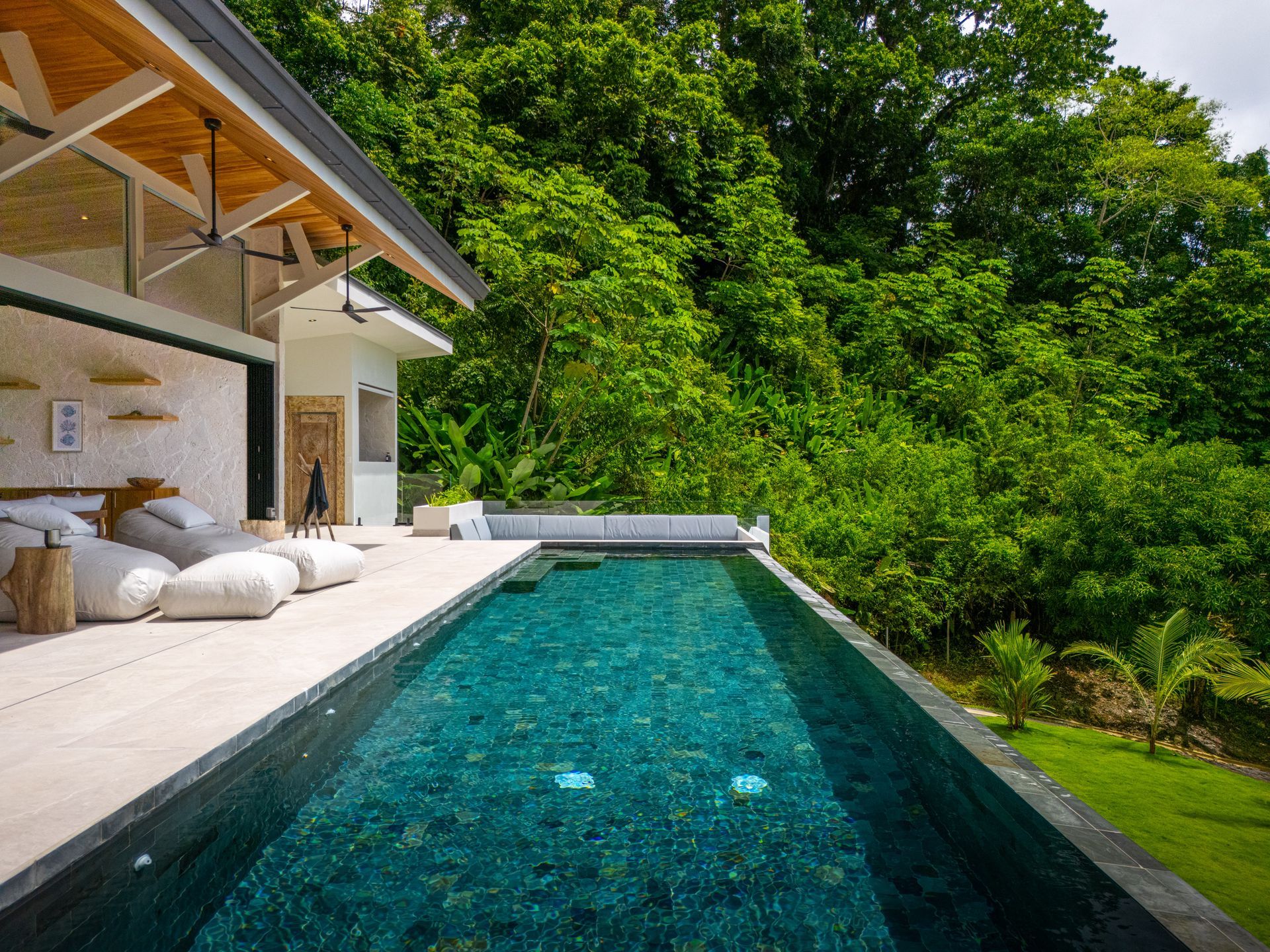 The grounds add yet another layer of immersion: a flat sodded area perfect for games or lounging under the stars, while tropical gardens and fruit trees cascade down the front slope, connecting the villa to its fertile setting.