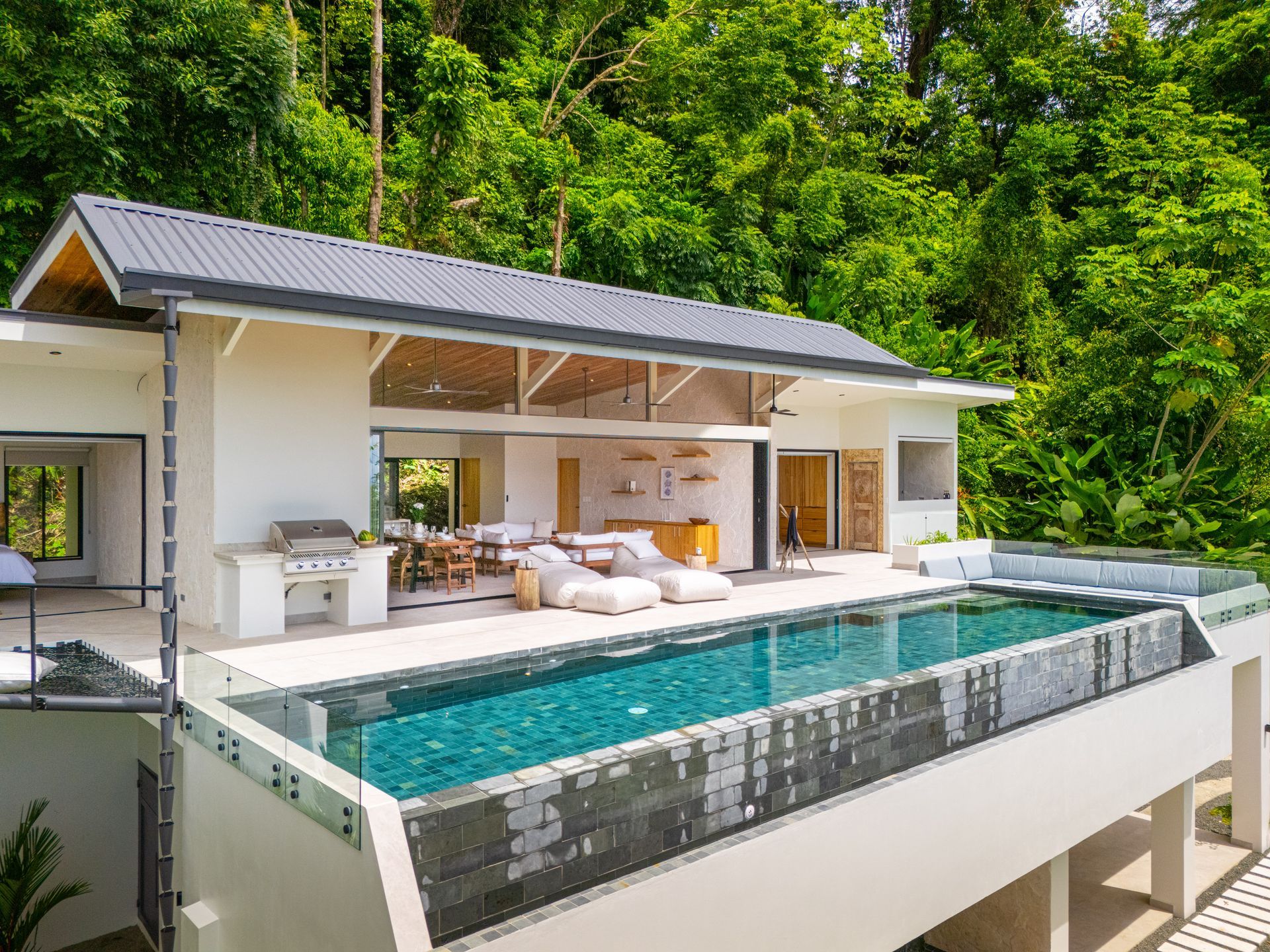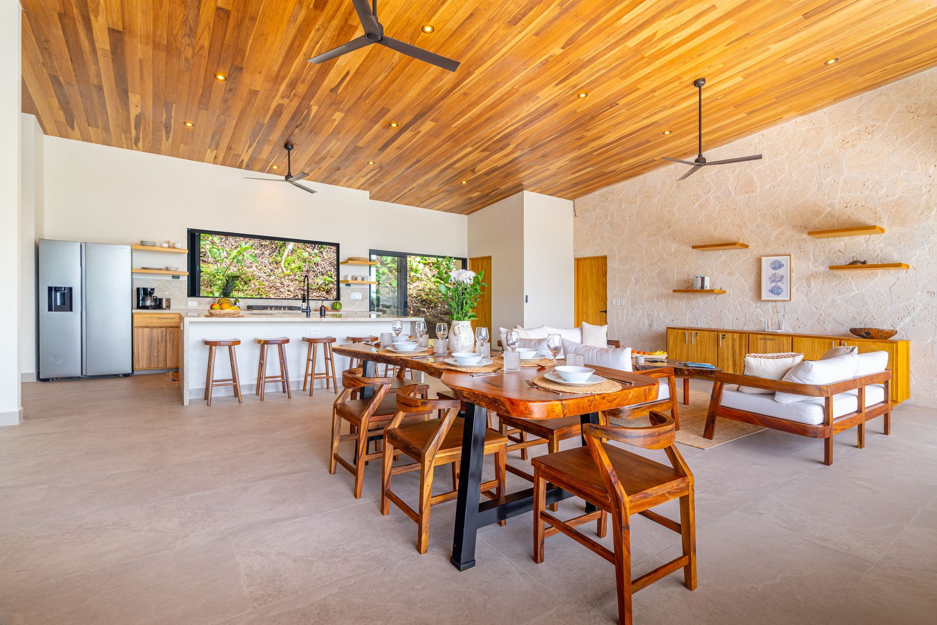 The kitchen is a chef’s dream, with a sculptural island featuring waterfall edges and seating for five. Accordion windows open the kitchen fully to the jungle, creating an open-air cooking and dining experience. Together, the living, dining, and kitchen spaces form a seamless flow perfect for both intimate family moments and larger gatherings.