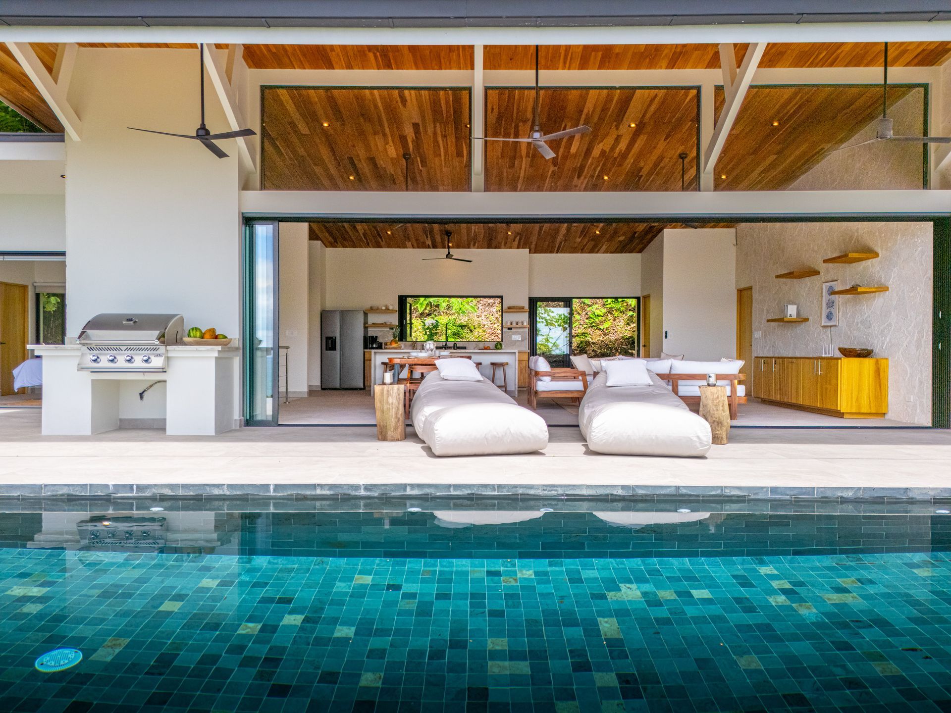 Outdoor living defines the villa. A sunken sofa lounge with deep built-in seating creates a luxurious gathering space, while the expansive deck offers room for yoga, entertaining, or simply soaking in the views. A built-in gas grill sets the stage for alfresco dining.