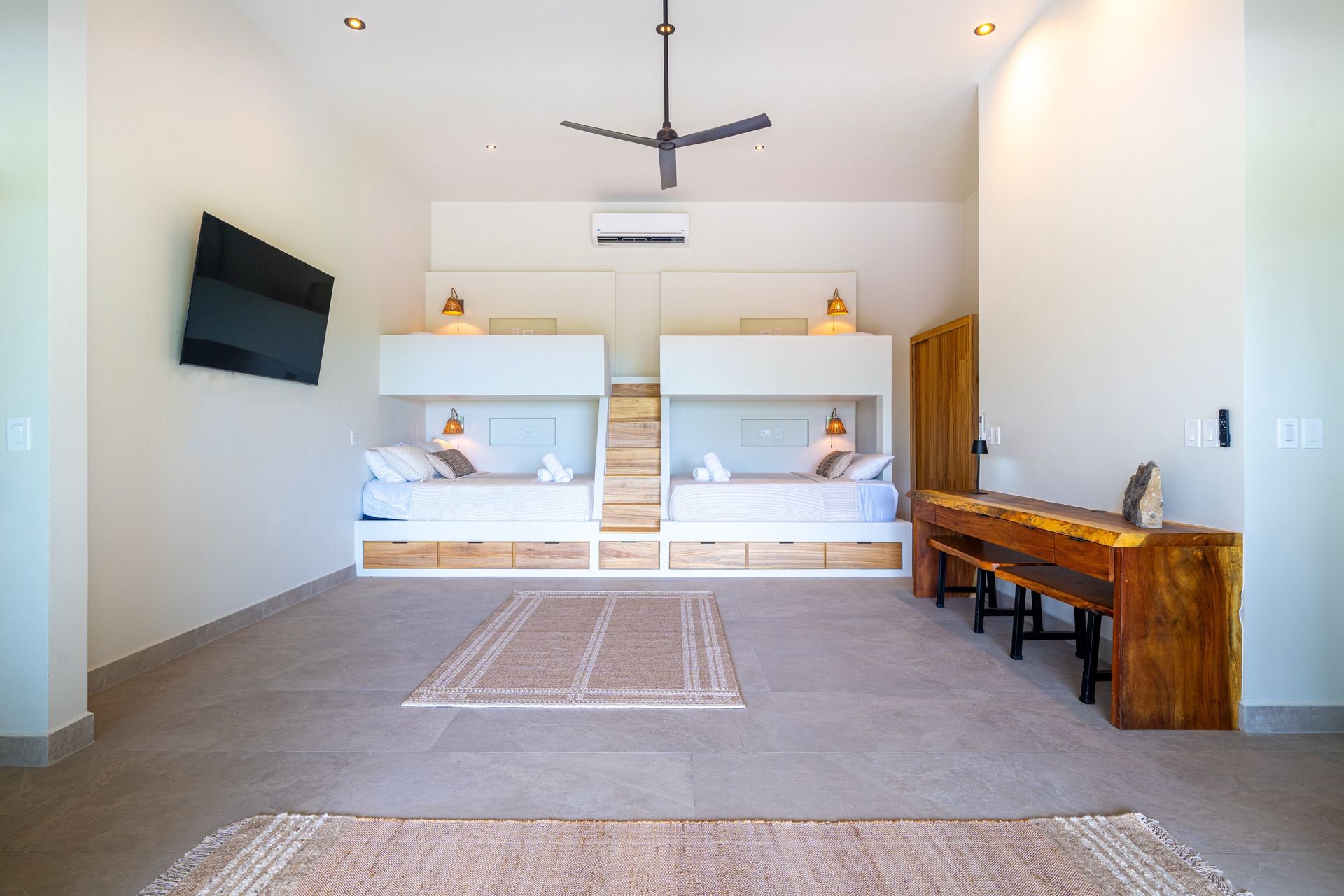 The Family Suite is designed for groups or families, and balances sophistication with comfort. Two custom-built in queen beds, each with twin bunks above, maximize space while maintaining elegance. A large Guanacaste wood desk anchors the room, perfect for writing or work. Sliding glass doors open to a covered patio, where a coral stone accent wall and cascading waterfall set a tranquil scene.