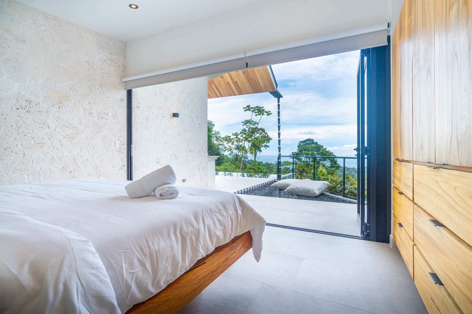 The Jungle Suite offers a backdrop of rainforest that feels like living art, with windows capturing scenes as vivid as paintings on the wall. Its bathroom is designed as an open-air retreat, with accordion windows on either end that open fully to the jungle, creating a seamless connection while you shower. Natural stone, organic textures, and retractable glass doors tie the space together in a setting that is equal parts dramatic and serene.